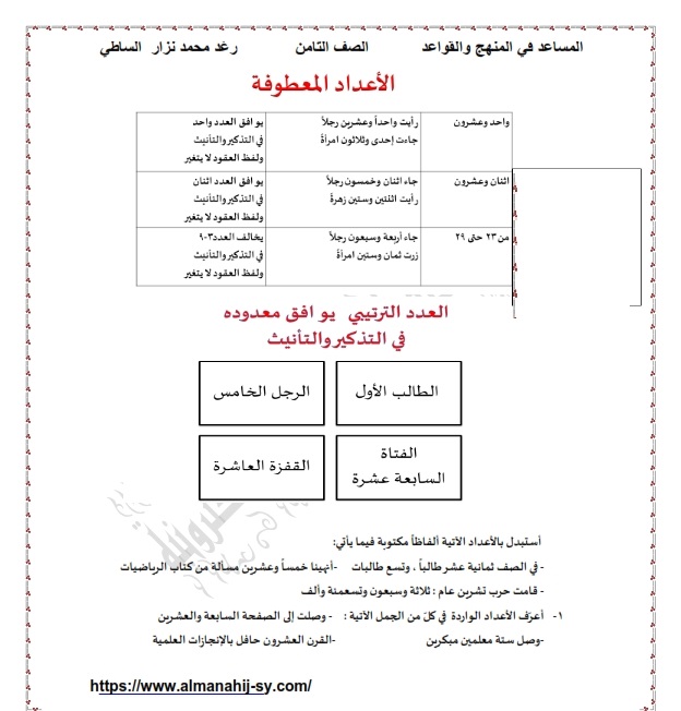 حكمها في العدد المركب أن توافق المعدود وقد وافقته في الآية فجاءت مذكرة مثل ه وف تحت شينها والقاعدة أن ت فتح مع المذك ر. في النحو العربي العدد هو اسم ن ك رة يدل على مقدار الأشياء المعدودة وترتيبها. الكلية كلية التربية للعلوم الانسانية القسم قسم اللغة العربية المرحلة 4. ي سم ى المعدود أيضا تمييز العدد.
