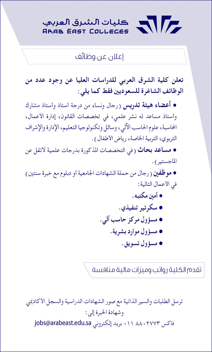كلية الشرق العربي الملحقية الثقافية السعودية تعلن وظائف اعضاء هيئة تدريس بكليات الشرق العربي في الرياض لغير السعوديين لعام 2020 و 2021