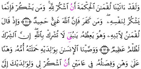 أهل القرآن الكريم سورة لقمان صفحة ٤١٢ من الآيه ١٢ الى آيه ١٩ مع التفسير الميسر ب ل غوا ع ن ى و ل و آيه قال ر سول الله صلى الله ع ليه