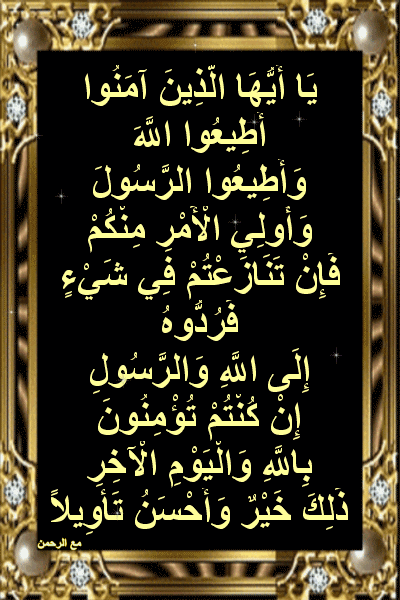 ي ا أ ي ه ا ال ذ ين آم ن وا أ ط يع وا الل ه و أ ط يع وا الر س ول و أ ول ي ال أ م ر م ن ك م ف إ ن ت ن از ع ت م ف ي ش ي ء ف ر د وه إ ل ى الل ه و الر س ول إ ن ك ن ت م ت ؤ م ن ون ب الل ه و ال ي و م ال آخ ر ذ ل ك خ ي ر و أ ح س ن